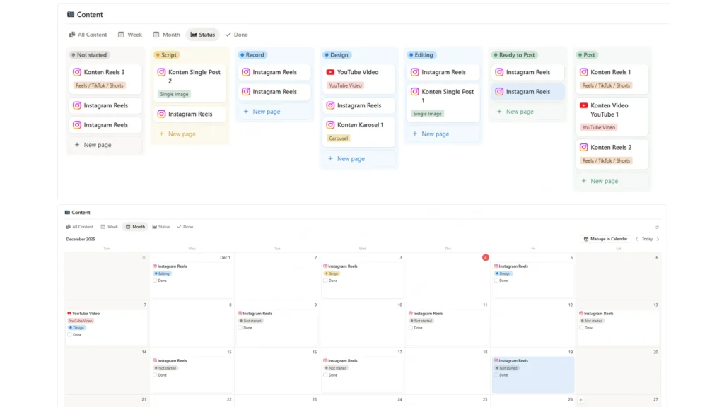 Rencanakan konten mingguan & bulanan dengan kalender konten, lengkap dengan status progres biar workflow kamu lebih rapi.