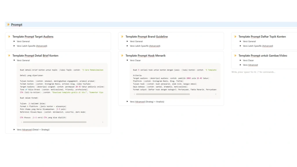 Bikin caption, ide, dan skrip konten dalam hitungan menit dengan prompt AI siap pakai yang ada di dalam template.
